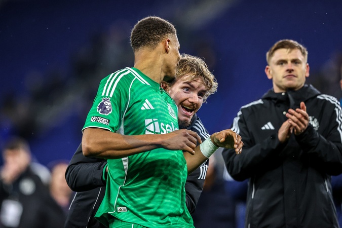 Nick Woltemade of Newcastle United and Malick Thiaw of Newcastle United celebrate the win during the Premier League match Everton vs Newcastle United at Hill Dickinson Stadium, Liverpool, United Kingdom, 29th November 2025, Credit:Ae Cosgrove/News Images / Avalon