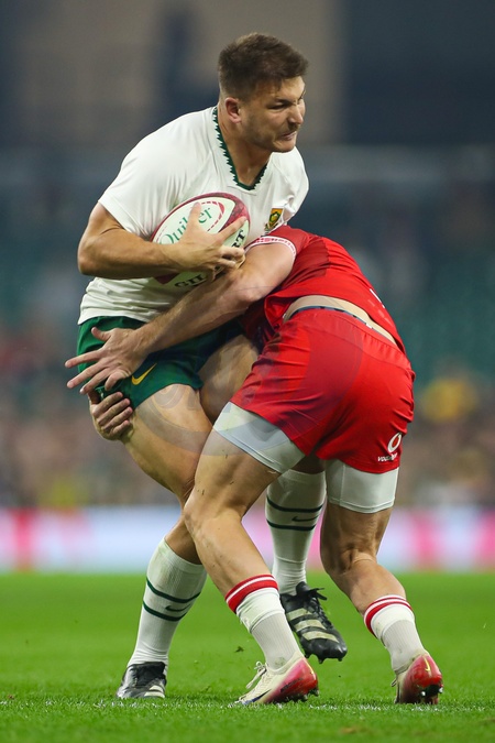 Andre Esterhuizen of South Africa is tackled during the Quilter Nations Series 2025 match Wales vs South Africa at Principality Stadium, Cardiff, United Kingdom, 29th November 2025, Credit:Andrew Lewis/News Images / Avalon