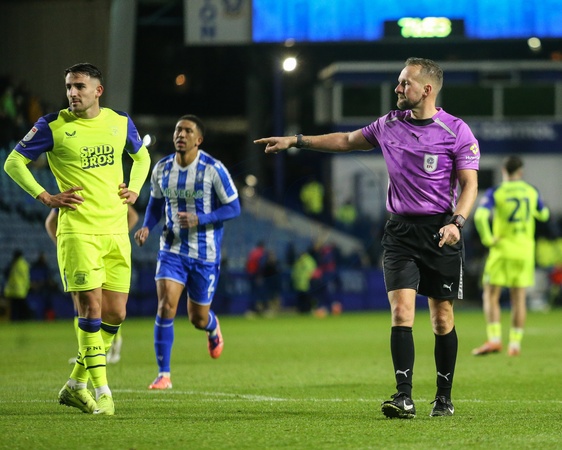 referee Oliver Langford awards Sheffield Wednesday a penalty during the Sky Bet Championship match Sheffield Wednesday vs Preston North End at Hillsborough, Sheffield, United Kingdom, 29th November 2025, Credit:Richard Bierton/News Images / Avalon
