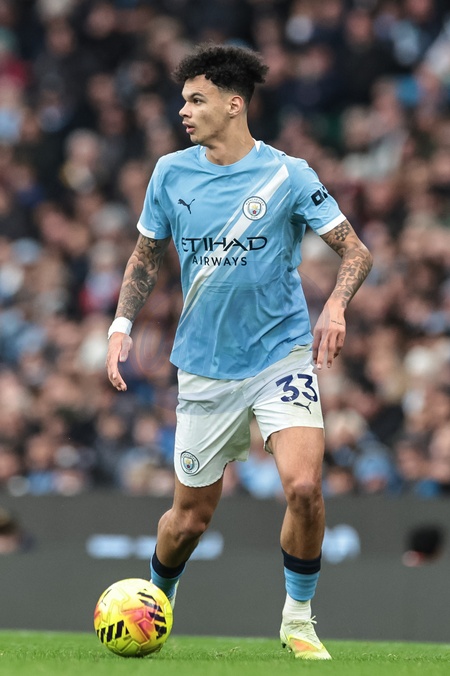 Nico O'Reilly of Manchester City with the ball during the Premier League match Manchester City vs Leeds United at Etihad Stadium, Manchester, United Kingdom, 29th November 2025, Credit:Mark Cosgrove/News Images / Avalon