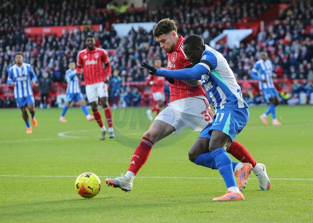 Yankuba Minteh of Brighton & Hove Albion is tackled by Neco Williams of Nottingham Forest during the Premier League match Nottingham Forest vs Brighton and Hove Albion at City Ground, Nottingham, United Kingdom, 30th November 2025, Credit:Richard Bierton/News Images / Avalon