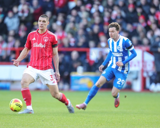 Nikola Milenkovic of Nottingham Forest passes the ball during the Premier League match Nottingham Forest vs Brighton and Hove Albion at City Ground, Nottingham, United Kingdom, 30th November 2025, Credit:Richard Bierton/News Images / Avalon