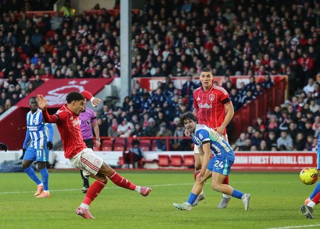 Morgan Gibbs-White of Nottingham Forest shoots on goal during the Premier League match Nottingham Forest vs Brighton and Hove Albion at City Ground, Nottingham, United Kingdom, 30th November 2025, Credit:Richard Bierton/News Images / Avalon