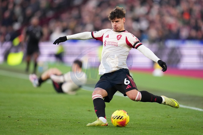 Milos Kerkez of Liverpool attempts cross during the Premier League match West Ham United vs Liverpool at London Stadium, London, United Kingdom, 30th November 2025, Credit:Harvey Murphy/News Images / Avalon