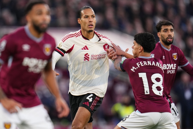 Virgil van Dijk of Liverpool and Mateus Fernandes of West Ham United battle during the Premier League match West Ham United vs Liverpool at London Stadium, London, United Kingdom, 30th November 2025, Credit:Harvey Murphy/News Images / Avalon