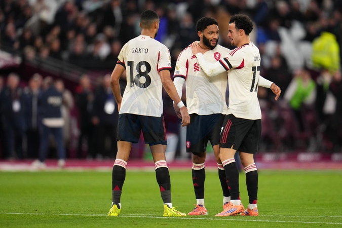 Liverpool celebrate second goal during the Premier League match West Ham United vs Liverpool at London Stadium, London, United Kingdom, 30th November 2025, Credit:Harvey Murphy/News Images / Avalon