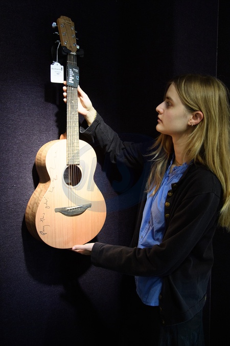 A staff member views 'A Signed Sheeran/Lowden W01 Acoustic Guitar' by Ed Sheeran (£2k - £3k) which is on auction at Bonhams Sound & Cinema: With Property from The Marianne Faithfull Estate Sale ending from 3rd December 2025 at Bonhams in London, England, UK on Monday 1 December, 2025., Credit:Justin Ng / Avalon