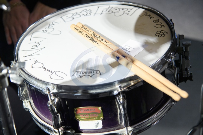 A staff member views A Yamaha 9000 Recording Custom Drum Kit and drumsticks both signed by Nick Mason (est. £4k - £6k) which is on auction at Bonhams Sound & Cinema: With Property from The Marianne Faithfull Estate Sale ending from 3rd December 2025 at Bonhams in London, England, UK on Monday 1 December, 2025., Credit:Justin Ng / Avalon