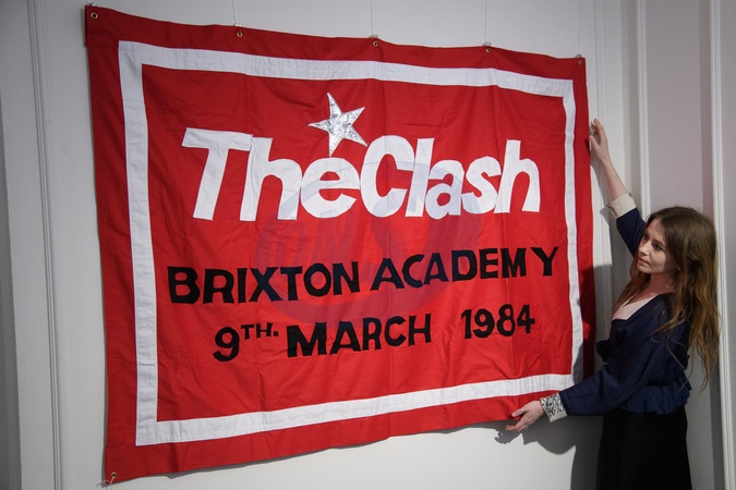A staff member views 'Louis Theroux's First Concert - sewn cotton red banner, with The Clash Brixton Academy 9th March 1984 embroidered to centre of banner' by Jeremy Deller x Louis Theroux (est. £8k - £10k) which is on auction at Bonhams Sound & Cinema: With Property from The Marianne Faithfull Estate Sale ending from 3rd December 2025 at Bonhams in London, England, UK on Monday 1 December, 2025., Credit:Justin Ng / Avalon