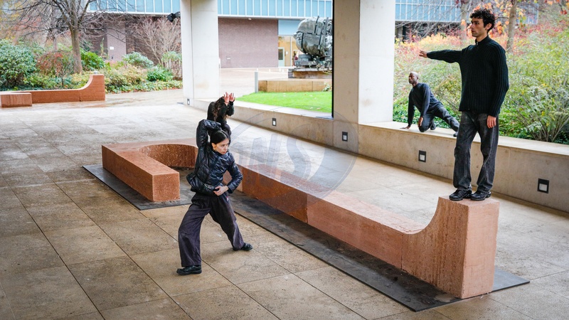 London, UK. 01st Dec, 2025. Dancers create movement around the forms of the work. 'Open Monuments' by Melek Zeynep Bulut, is a new public installation and London Design Festival Landmark Project in the courtyard of the Design Museum in Kensington. LDF will present Open Monuments by Melek Zeynep Bulut at the Design Museum from 1 - 14 Dec 2025., Credit:Imageplotter / Avalon