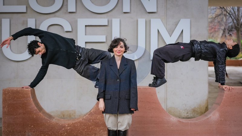 London, UK. 01st Dec, 2025. Artist Melek Zeynep Bulut poses with her work and two dancers. 'Open Monuments' by Melek Zeynep Bulut, is a new public installation and London Design Festival Landmark Project in the courtyard of the Design Museum in Kensington. LDF will present Open Monuments by Melek Zeynep Bulut at the Design Museum from 1 - 14 Dec 2025., Credit:Imageplotter / Avalon