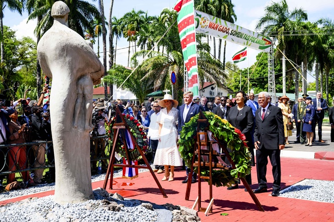 Paramaribo, The Netherlands, 2025-12-01 11:34:47PARAMARIBO, December 1, 2025, Mama Sranan. King Willem-Alexander and Queen Máxima are paying a state visit to the Republic of Suriname at the invitation of President Jennifer Geerlings-Simons. King Willem-Alexander and Queen Máxima lay a wreath at the statue of Mama Sranan, which symbolizes "Mother Suriname." The statue depicts a woman holding five children, who represent the ethnic groups of Suriname. PHOTO: NLBeeld/Patrick van Emst, Credit:Avalon