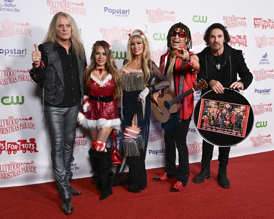 November 30, 2025, Hollywood, California, USA: (L-R) Canadian-American singer and actor SEBASTIAN BACH of Skid Row, SUZANNE LE BACH, JANEA EBS, JASON EBS AND ADAM KUR of Jet Velocity Holiday All Star Band attend the 93rd Annual Hollywood Christmas Parade: Hollywood RED CARPET., Credit:ZUMAPRESS.com / Avalon