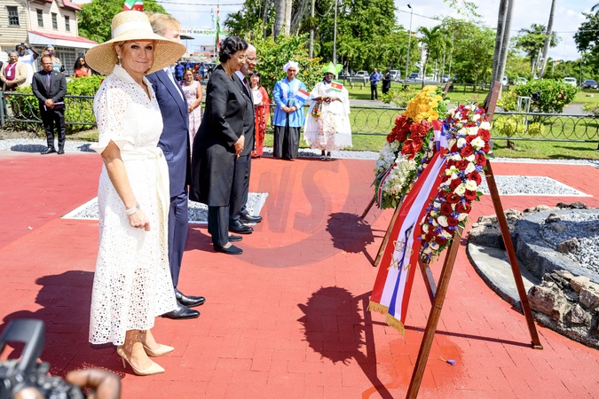 Paramaribo, The Netherlands, 2025-12-01 11:34:49PARAMARIBO, December 1, 2025, Mama Sranan. King Willem-Alexander and Queen Máxima are paying a state visit to the Republic of Suriname at the invitation of President Jennifer Geerlings-Simons. King Willem-Alexander and Queen Máxima lay a wreath at the statue of Mama Sranan, which symbolizes "Mother Suriname." The statue depicts a woman holding five children, who represent the people groups of Suriname. PHOTO: NLBeeld/Patrick van Emst, Credit:Avalon