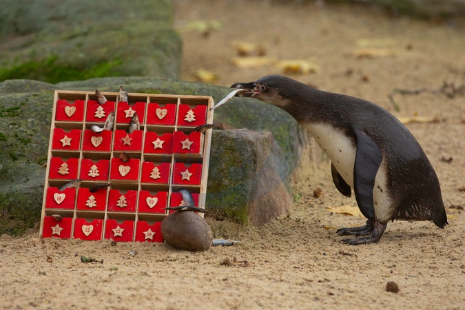 Penguins inspect an advent calendar at London Zoo’s Penguin Beach