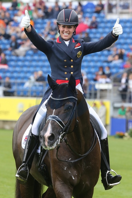 Europameisterin Charlotte Dujardin (GBR) zeigt doppelten Daumen hoch nach Ihrem Ritt zum Titel mit Ihrem Pferd Valegro, D2 Meggle-preis, // during the FEI European Championships Aachen 2015 at the Aachener Soers in Aachen, Germany on 2015/08/15. EXPA Pictures © 2015, PhotoCredit: EXPA/ Eibner-Pressefoto/ Roskaritz*****ATTENTION - OUT of GER*****, Credit:EXPA/ Eibner/ Roskaritz / Avalon