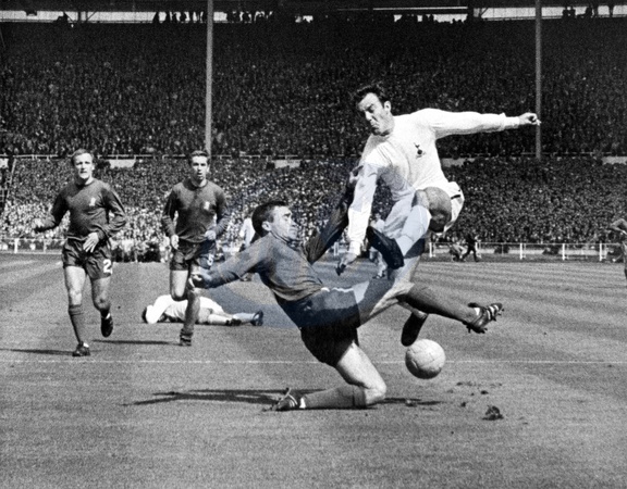 20th May 1967: The FA cup final at Wembley Stadium. Tottenham Hotspur (2) versus Chelsea (1).Photo shows: With tangled feet in a tussle for the ball are Jimmy Greaves (white shirt) and Chelsea captain, Ron Harris. Other players are Chelsea's Alan Harris (extreme left) and Marvin Hinton, just in front of a fallen Spurs player. Of course, Spurs were dead lucky to get the result., Credit:TALKING SPORT/Photoshot / Avalon
