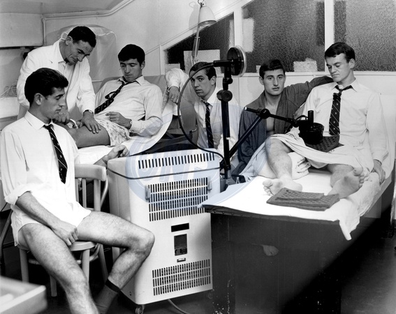Five Chelsea players are seen receiving treatment at Stamford Bridge after picking up injuries during the Fairs Cup match against Roma.Left to right are Peter Bonetti, trainer Harry Medhurst, Terry Venables, Marvin Hinton, Albert Murray and Eddie McCreadie.8th October 1965., Credit:TALKING SPORT/Photoshot / Avalon