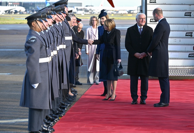 LONDON, ENGLAND - DECEMBER 03: Prince William, Prince of Wales (R) speaks with the President of the Federal Republic of Germany Frank-Walter Steinmeier as Catherine, Princess of Wales introduces dignitaries to his wife Elke Büdenbender at Heathrow Airport on December 03, 2025 in London, England. The President of the Federal Republic of Germany, accompanied by Ms. Elke Büdenbender, are paying a State Visit to the United Kingdom as the guests of Their Majesties The King and Queen. The visit is the first from Germany in 27 years and will be marked with ceremonial visits, an address to the UK parliament and a banquet., Credit:Jeff Spicer / Avalon