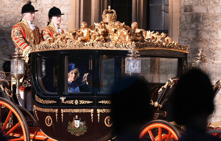 Queen Camilla and Elke Budenbender arrive in the Australian State Coach to a ceremonial welcome at Windsor Castle, Berkshire, on day one of the state visit to the UK by the President of the Federal Republic of Germany. Picture date: Wednesday December 3, 2025., Credit:Andrew Matthews / Avalon