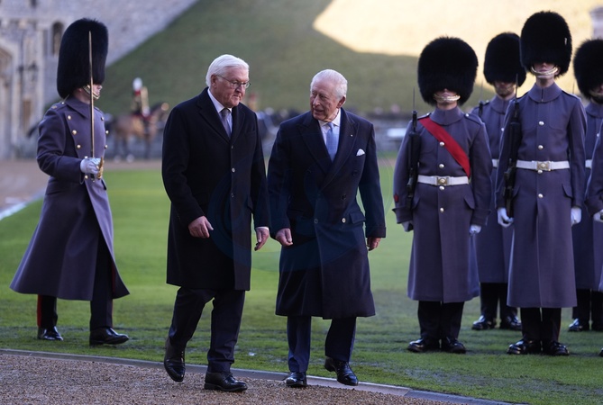 German President Frank-Walter Steinmeier and King Charles III after inspecting a Guard of Honour during the ceremonial welcome at Windsor Castle, Berkshire, on day one of the state visit to the UK by the President of the Federal Republic of Germany. Picture date: Wednesday December 3, 2025., Credit:Andrew Matthews / Avalon