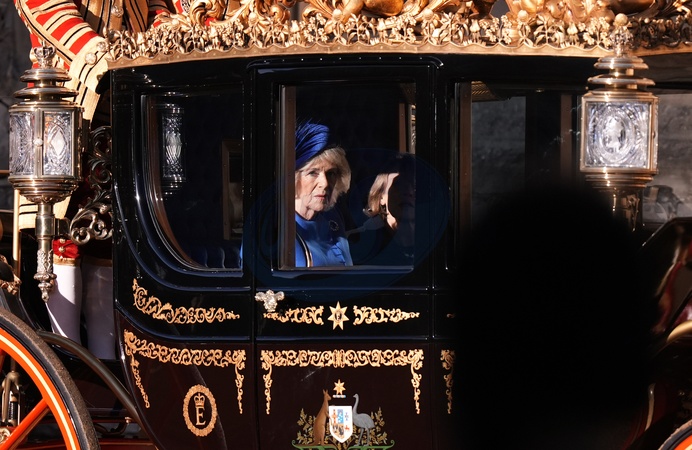 Queen Camilla and Elke Budenbender arrive in the Australian State Coach to a ceremonial welcome at Windsor Castle, Berkshire, on day one of the state visit to the UK by the President of the Federal Republic of Germany. Picture date: Wednesday December 3, 2025., Credit:Andrew Matthews / Avalon