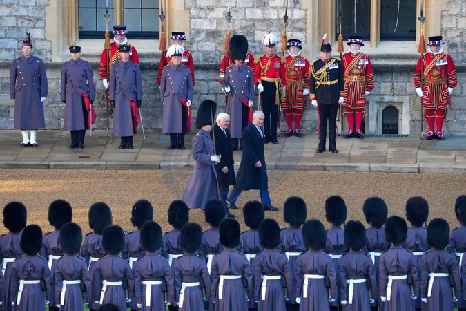 WINDSOR, ENGLAND - DECEMBER 03: King Charles III (R) and President of the Federal Republic of Germany Frank-Walter Steinmeier (C) smile during the ceremonial welcome for the state visit to the UK at Windsor Castle on December 03, 2025 in Windsor, England. The President of the Federal Republic of Germany, accompanied by Ms. Elke Büdenbender, are paying a State Visit to the United Kingdom as the guests of Their Majesties The King and Queen. The visit is the first from Germany in 27 years and will be marked with ceremonial visits, an address to the UK parliament and a banquet., Credit:Carl Court / Avalon