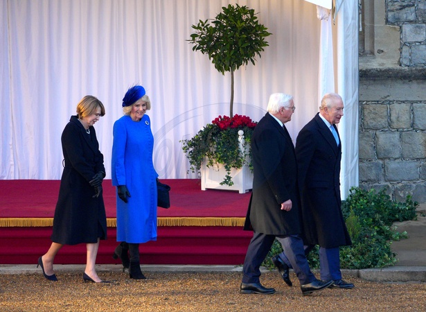 WINDSOR, ENGLAND - DECEMBER 03: King Charles III (R) speaks with President of the Federal Republic of Germany Frank-Walter Steinmeier and Elke Büdenbender, wife of the President of the Federal Republic of Germany (L) smiles with Queen Camilla during the ceremonial welcome for the state visit to the UK at Windsor Castle on December 03, 2025 in Windsor, England. The President of the Federal Republic of Germany, accompanied by Ms. Elke Büdenbender, are paying a State Visit to the United Kingdom as the guests of Their Majesties The King and Queen. The visit is the first from Germany in 27 years and will be marked with ceremonial visits, an address to the UK parliament and a banquet., Credit:Carl Court / Avalon