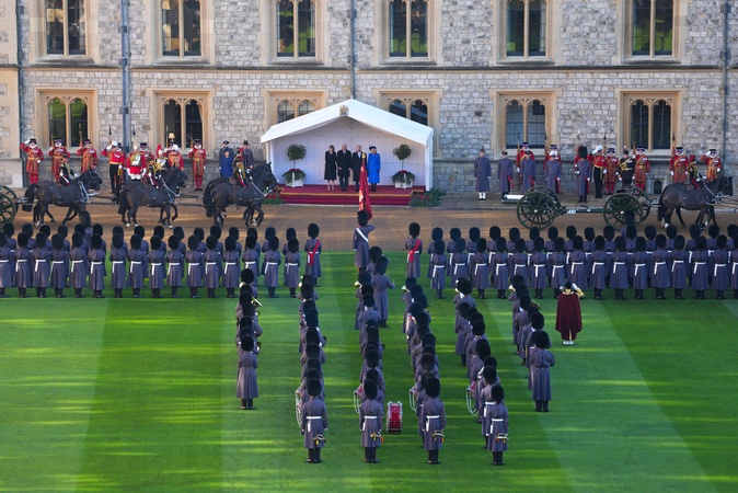 WINDSOR, ENGLAND - DECEMBER 03: A general view as King Charles III and Queen Camilla with the President of the Federal Republic of Germany Frank-Walter Steinmeier and his wife Elke Büdenbender and Catherine, Princess of Wales and Prince William, Prince Of Wales watch a military procession during the ceremonial welcome for the state visit to the UK at Windsor Castle on December 03, 2025 in Windsor, England. The President of the Federal Republic of Germany, accompanied by Ms. Elke Büdenbender, are paying a State Visit to the United Kingdom as the guests of Their Majesties The King and Queen. The visit is the first from Germany in 27 years and will be marked with ceremonial visits, an address to the UK parliament and a banquet., Credit:Carl Court / Avalon