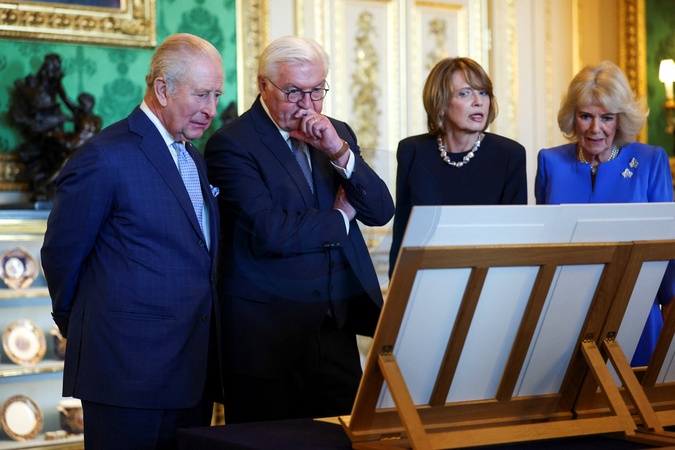Britain's King Charles, Queen Camilla, German President Frank-Walter Steinmeier and his wife Elke Buedenbender view items on display relating to Germany, during a visit to the Royal Collection exhibition in the Green Drawing Room at Windsor Castle, during Steinmeier's state visit to Britain, in Windsor, Britain, December 3, 2025. REUTERS/Hannah, Credit:Hannah McKay / Avalon
