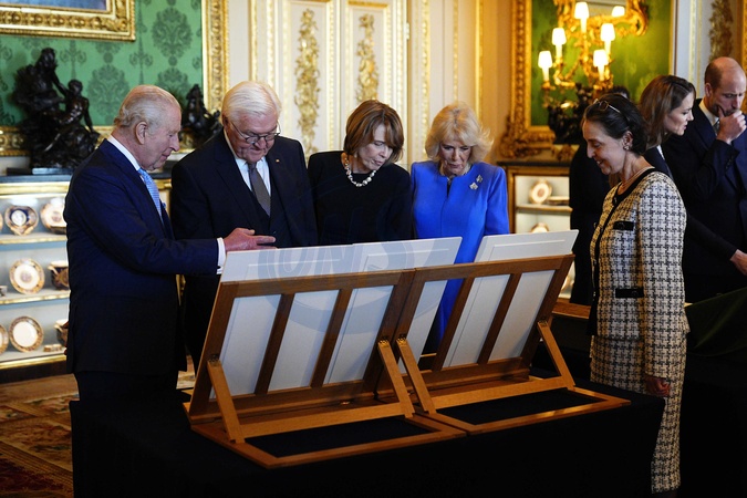 King Charles III and Queen Camilla with German President Frank-Walter Steinmeier and his wife Elke Budenbender, view exhibits from the Royal Collection in the Green Drawing room at Windsor Castle, Berkshire, on day one of the state visit to the UK by the President of the Federal Republic of Germany. Picture date: Wednesday December 3, 2025., Credit:Aaron Chown / Avalon