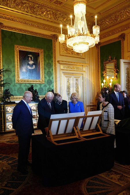 King Charles III and Queen Camilla with German President Frank-Walter Steinmeier and his wife Elke Budenbender, view exhibits from the Royal Collection in the Green Drawing room at Windsor Castle, Berkshire, on day one of the state visit to the UK by the President of the Federal Republic of Germany. Picture date: Wednesday December 3, 2025., Credit:Aaron Chown / Avalon