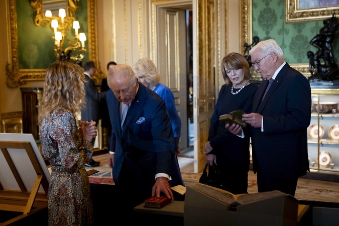 King Charles III and Queen Camilla with German President Frank-Walter Steinmeier and his wife Elke Budenbender, view exhibits from the Royal Collection in the Green Drawing room at Windsor Castle, Berkshire, on day one of the state visit to the UK by the President of the Federal Republic of Germany. Picture date: Wednesday December 3, 2025., Credit:Aaron Chown / Avalon