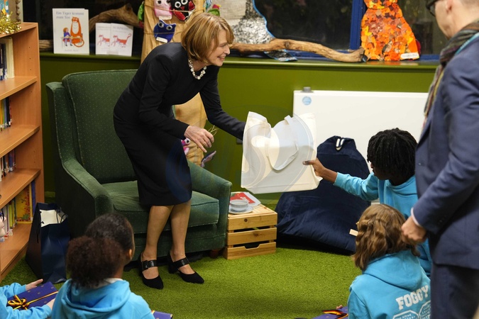 Elke Budenbender, wife of German President Frank-Walter Steinmeier, is presented with a gift during a visit to the Judith Kerr Primary School in Herne Hill, south east London, on day one of the state visit to the UK by the President of the Federal Republic of Germany. Picture date: Wednesday December 3, 2025., Credit:Jordan Pettitt / Avalon