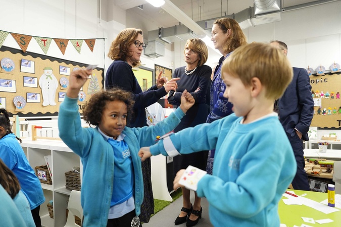 Elke Budenbender (centre), wife of German President Frank-Walter Steinmeier, during a visit to the Judith Kerr Primary School in Herne Hill, south east London, on day one of the state visit to the UK by the President of the Federal Republic of Germany. Picture date: Wednesday December 3, 2025., Credit:Jordan Pettitt / Avalon