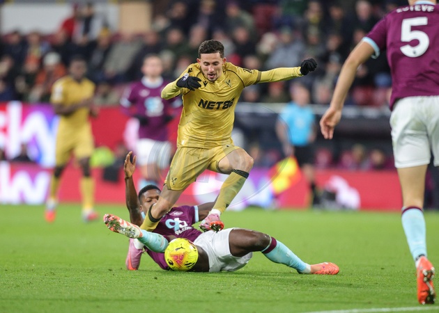 Florentino Luis of Burnley slides in on Yeremi Pino of Crystal Palace during the Premier League match Burnley vs Crystal Palace at Turf Moor, Burnley, United Kingdom, 3rd December 2025, Credit:Richard Bierton/News Images / Avalon