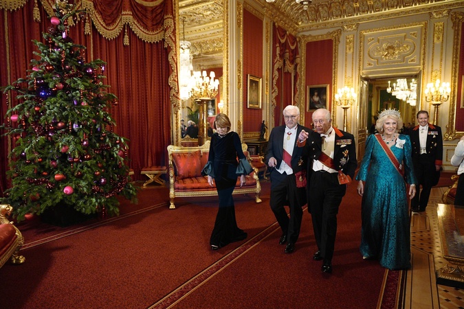 King Charles III and Queen Camilla (right) with German President Frank-Walter Steinmeier and his wife Elke Budenbender ahead of the state banquet for the German President and his wife, at Windsor Castle, Berkshire, on day one of their state visit to the UK. Picture date: Wednesday December 3, 2025., Credit:Aaron Chown / Avalon