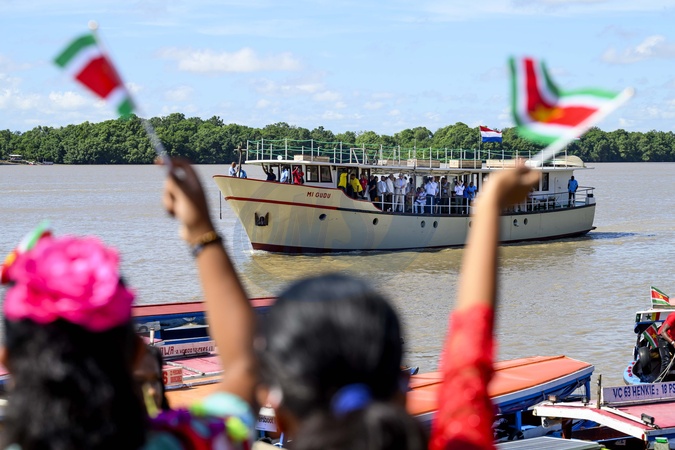 Paramaribo, The Netherlands, 2025-12-03 10:38:48PARAMARIBO, December 3, 2025, Mi Gudu. King Willem-Alexander and Queen Máxima are paying a state visit to the Republic of Suriname at the invitation of President Jennifer Geerlings-Simons. This includes a boat trip on the Suriname River and the Commewijne River. During the trip, the Royal Couple will receive an explanation of the value of the rivers (water) and mangroves (forest) to Suriname from a spiritual, economic, and ecological perspective. PHOTO: NLBeeld/Patrick van Emst, Credit:Avalon