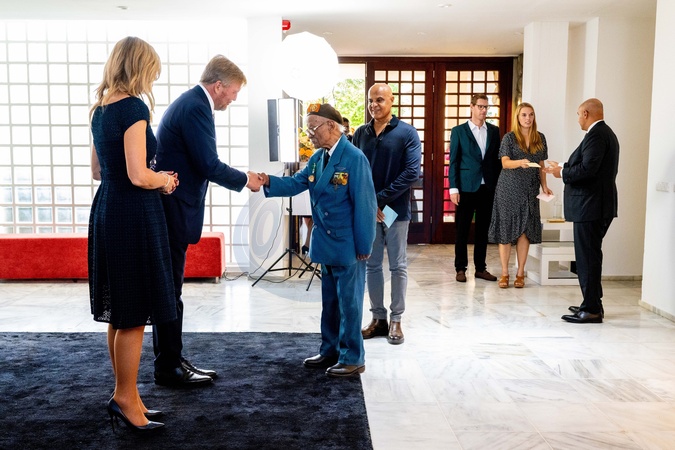 Paramaribo, The Netherlands, 2025-12-03 17:38:54PARAMARIBO, December 3, 2025, Dutch Residence. King Willem-Alexander and Queen Máxima are paying a state visit to the Republic of Suriname at the invitation of President Jennifer Geerlings-Simons. The third and final day of the state visit will conclude with a reception for the Dutch community. At the residence, the Royal Couple will speak with Dutch people living or working in Suriname. PHOTO: NLBeeld/Patrick van Emst. Pictured: Dick Lock in conversation with Queen Máxima., Credit:Avalon