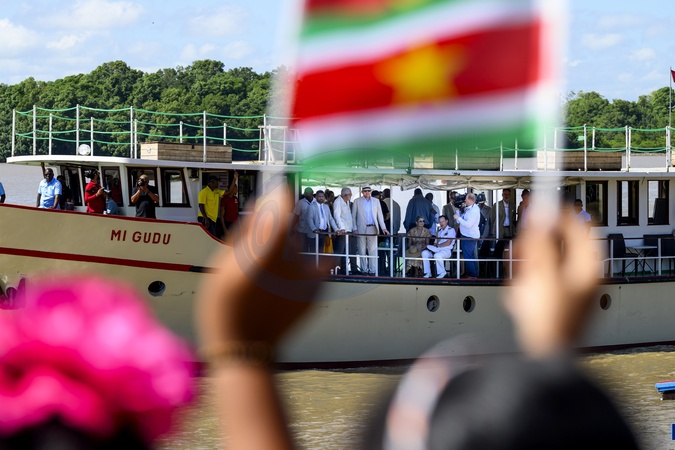 Paramaribo, The Netherlands, 2025-12-03 10:38:58PARAMARIBO, December 3, 2025, Mi Gudu. King Willem-Alexander and Queen Máxima are paying a state visit to the Republic of Suriname at the invitation of President Jennifer Geerlings-Simons. This includes a boat trip on the Suriname River and the Commewijne River. During the trip, the Royal Couple will receive an explanation of the value of the rivers (water) and mangroves (forest) to Suriname from a spiritual, economic, and ecological perspective. PHOTO: NLBeeld/Patrick van Emst, Credit:Avalon