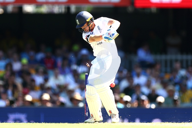 Ollie Pope of England gets bowled by Mitchell Starc of Australia during the NRMA Insurance Ashes Second Test Day 1 Series match Australia vs England at The Gabba, Brisbane Cricket Ground, Brisbane, United Kingdom, 4th December 2025, Credit:Patrick Hoelscher/News Images / Avalon