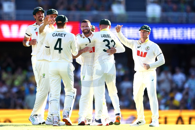 Michael Neser of Australia celebrates dismissing Zak Crawley of England during the NRMA Insurance Ashes Second Test Day 1 Series match Australia vs England at The Gabba, Brisbane Cricket Ground, Brisbane, Australia, 4th December 2025, Credit:Patrick Hoelscher/News Images / Avalon