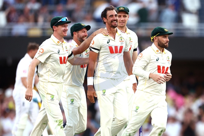 Mitchell Starc of Australia celebrates dismissing Harry Brook of England during the NRMA Insurance Ashes Second Test Day 1 Series match Australia vs England at The Gabba, Brisbane Cricket Ground, Brisbane, Australia, 4th December 2025, Credit:Patrick Hoelscher/News Images / Avalon