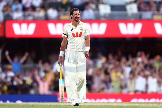 Mitchell Starc of Australia celebrates dismissing Harry Brook of England during the NRMA Insurance Ashes Second Test Day 1 Series match Australia vs England at The Gabba, Brisbane Cricket Ground, Brisbane, Australia, 4th December 2025, Credit:Patrick Hoelscher/News Images / Avalon