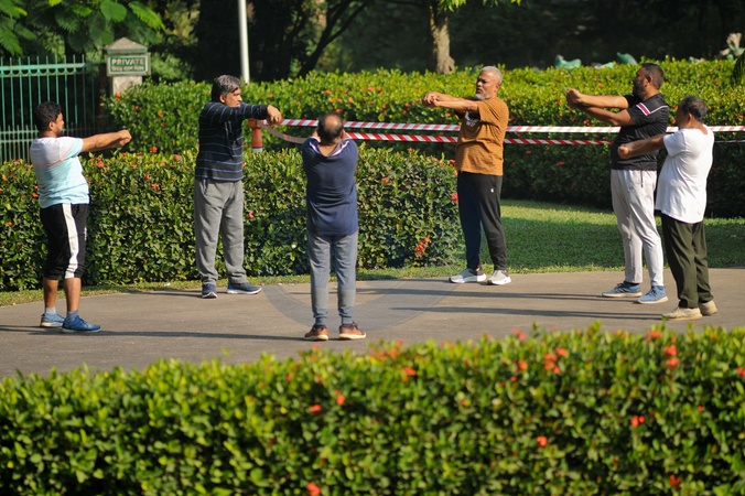 Chattogram, Bangladesh: Senior citizens gather for a group exercise routine on a sunny winter morning at the Chattogram War Cemetery Garden in Chattogram, Bangladesh, reflecting a growing emphasis on active ageing and community well-being., Credit:Md Rafayat Haque Khan / Avalon