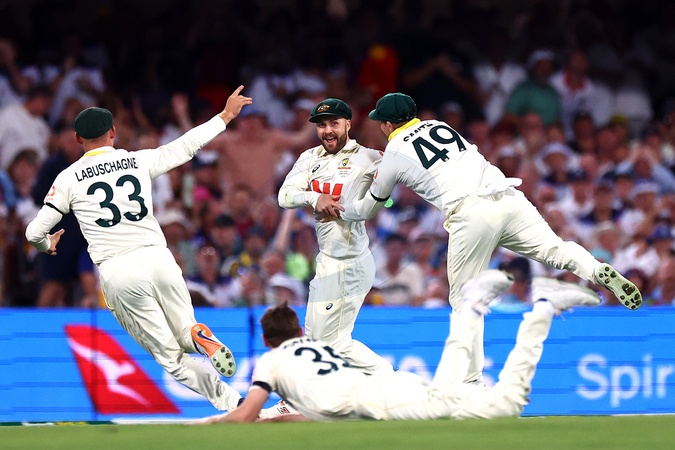 Josh Inglis of Australia celebrates the runout of Ben Stokes of England during the NRMA Insurance Ashes Second Test Day 1 Series match Australia vs England at The Gabba, Brisbane Cricket Ground, Brisbane, Australia, 4th December 2025, Credit:Patrick Hoelscher/News Images / Avalon