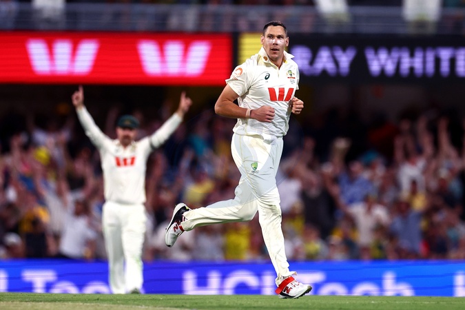 Scott Boland of Australia celebrates dismissing Jamie Smith of England during the NRMA Insurance Ashes Second Test Day 1 Series match Australia vs England at The Gabba, Brisbane Cricket Ground, Brisbane, Australia, 4th December 2025, Credit:Patrick Hoelscher/News Images / Avalon