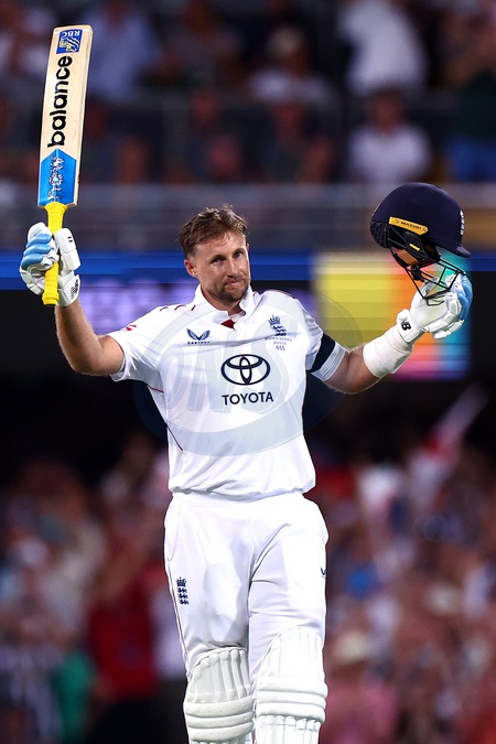 Joe Root of England celebrates reaching his century during the NRMA Insurance Ashes Second Test Day 1 Series match Australia vs England at The Gabba, Brisbane Cricket Ground, Brisbane, Australia, 4th December 2025, Credit:Patrick Hoelscher/News Images / Avalon