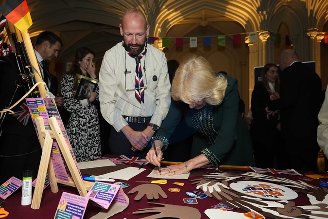 Queen Camilla draws an outline of her hand during a reception for volunteering charities in Windsor Castle, Berkshire, on day two of the state visit to the UK by the President of the Federal Republic of Germany. Picture date: Thursday December 4, 2025., Credit:Avalon.red / Avalon