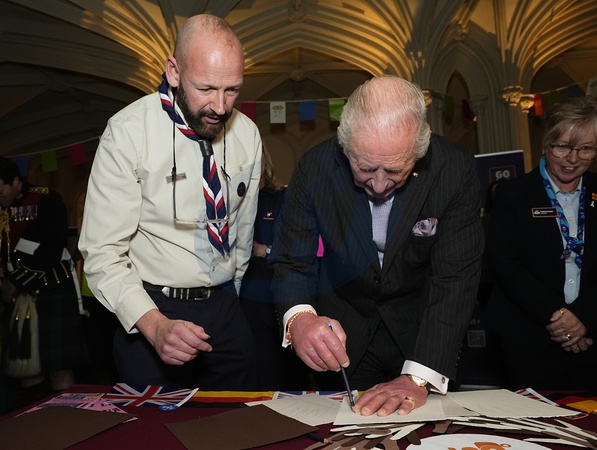 King Charles III draws an outline of his hand during a reception for volunteering charities in Windsor Castle, Berkshire, on day two of the state visit to the UK by the President of the Federal Republic of Germany. Picture date: Thursday December 4, 2025., Credit:Avalon.red / Avalon